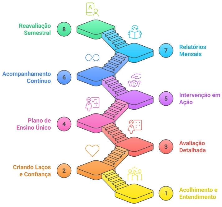 Na Adapt, acreditamos que o sucesso do tratamento começa com um plano de cuidado individualizado, feito sob medida para cada criança. Nosso método foi cuidadosamente desenhado para acolher e potencializar o desenvolvimento, respeitando o ritmo e as necessidades de cada paciente. Conheça as etapas que fazem parte da nossa jornada terapêutica: